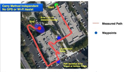 Целый сонм сенсоров, собранный Sensor Platforms в единую команду, способен на многое: рассчитывает дистанцию, которую вы уже прошли, учитывает все направления и траекторию движения. Все вычисления базируются на самой последней точке координат, о которой сообщил GPS-приёмник. Точность пеленгации и ориентирования настолько велика, что ошибка составит всего несколько % от отрезка пути, пройденного с последней известной точки.
